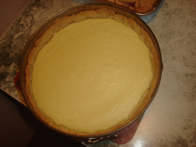 Atvėsusią tešlą kloti į kepimo formą (naudojau 28cm) ir paspaudyti karštus. Pilt varškės įdarą ir kepti 180C apie 20min, tada pamažinti 150C kol vidurys taps standus, viso apie 50-60min. Atvėsinti formoje.